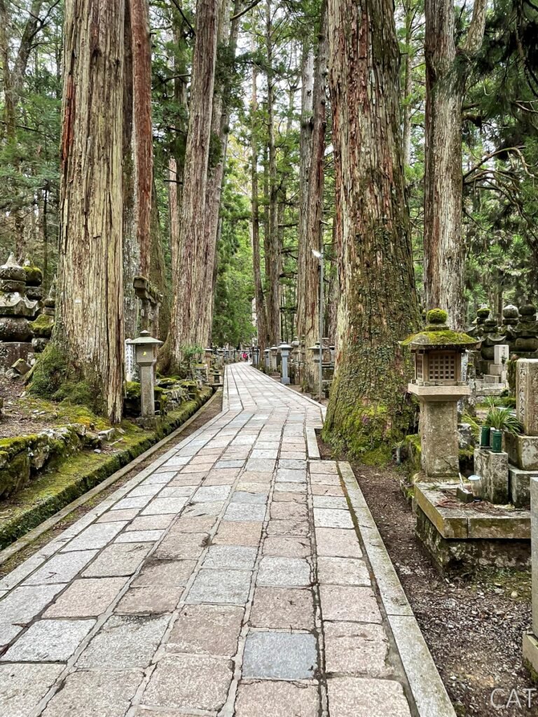 - Desde el puente Ichinohashi hasta el puente Gobyōbashi (30-45 min), un sendero de 2 km atraviesa el cementerio más grande de Japón, con más de 200.000 lápidas y faroles cubiertos de musgo. Incluye tumbas históricas de samuráis, sepulcros de señores feudales y monumentos conmemorativos de personajes célebres.