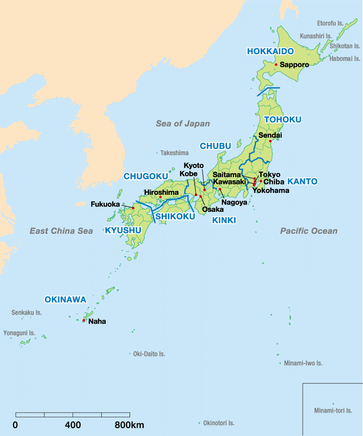 Japan is divided into 47 prefectures (administrative jurisdictions) and eight regions: Hokkaidō, Tōhoku, Kantō, Chūbu, Kansai, Chūgoku, Shikoku, Kyūshū, and Ryūkyū Islands.
