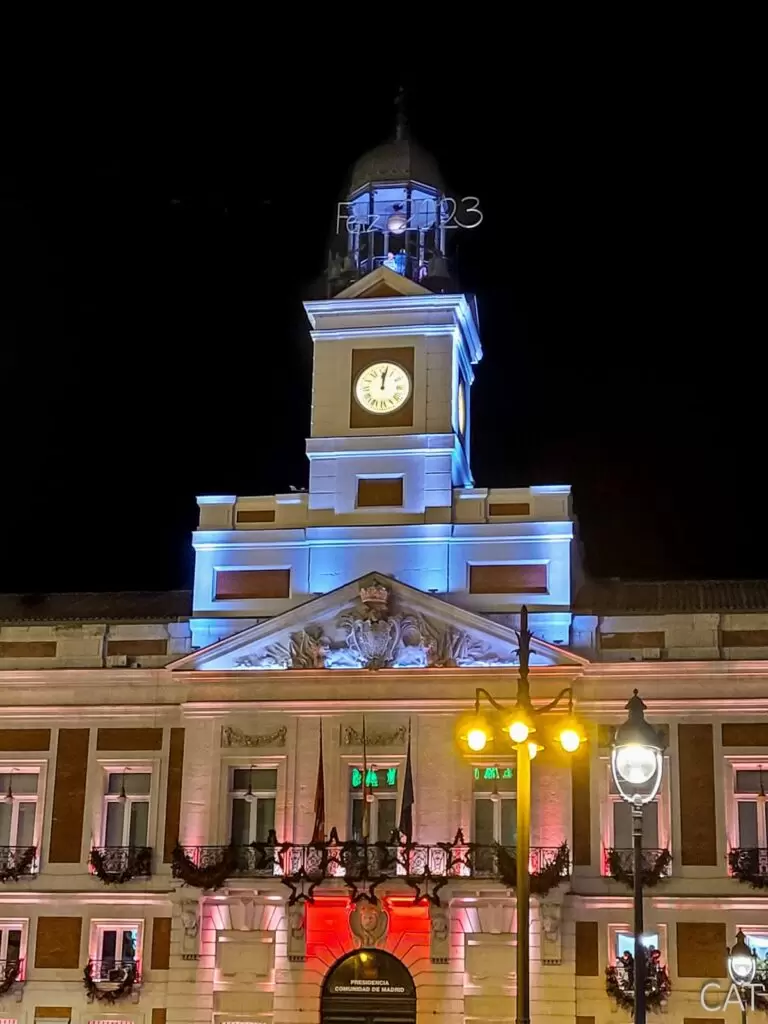 - The clock is situated on the top of the main building in the central square, which is also the headquarters of the regional government of Madrid. This clock tower is an iconic symbol of the city and a popular gathering spot for people to eat the traditional 12 grapes on New Year’s Eve, just before midnight.